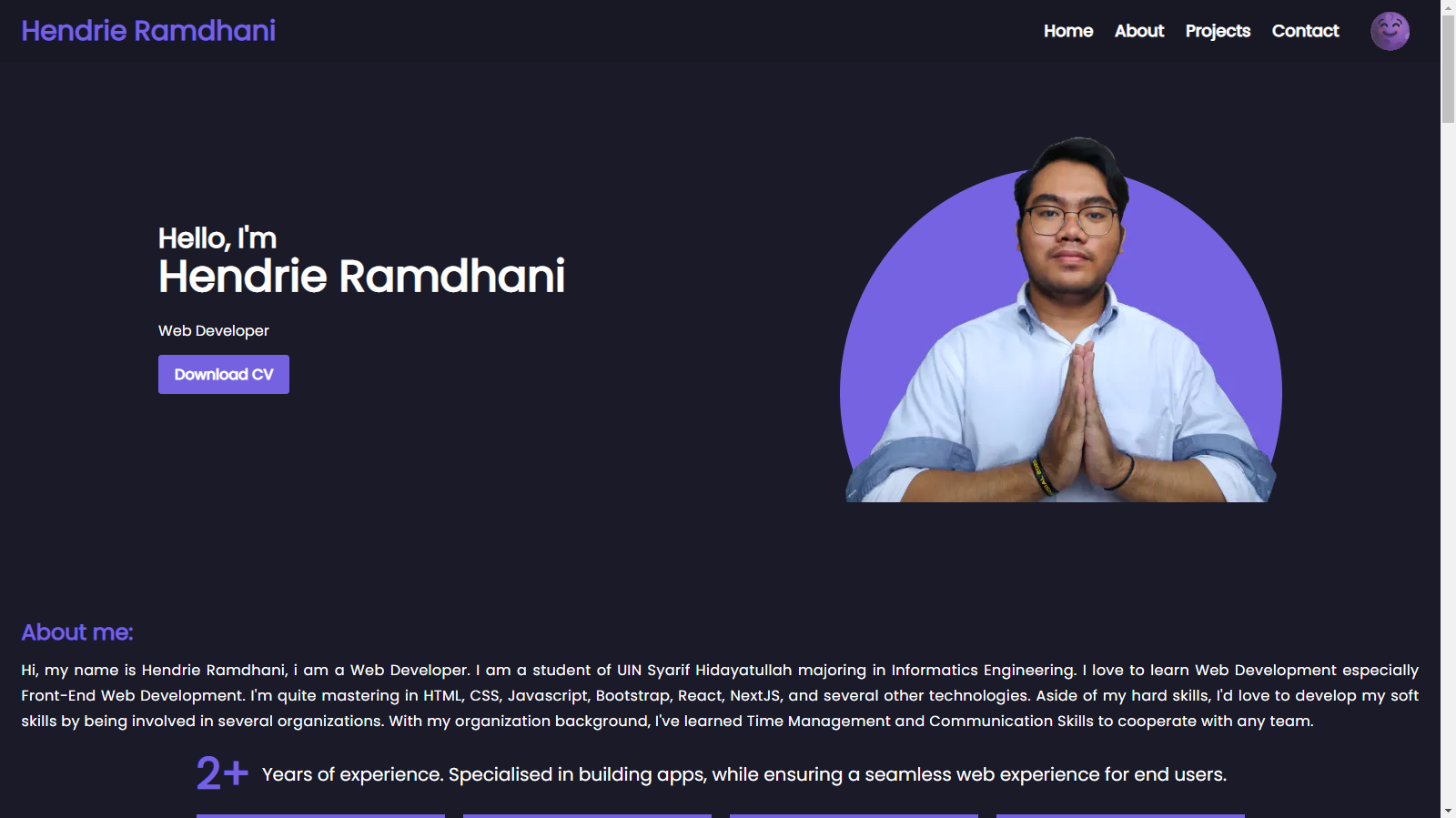 Hi, my name is Hendrie Ramdhani, i am a Web Developer. I am a student of UIN Syarif Hidayatullah majoring in Informatics Engineering. I love to learn Web Development especially Front-End Web Development. I'm quite mastering in HTML, CSS, Javascript, TailwindCSS, Bootstrap, React, NextJS, and several other technologies. Aside of my hard skills, I'd love to develop my soft skills by being involved in several organizations. With my organization background, I've learned Time Management and Communication Skills to cooperate with any team.