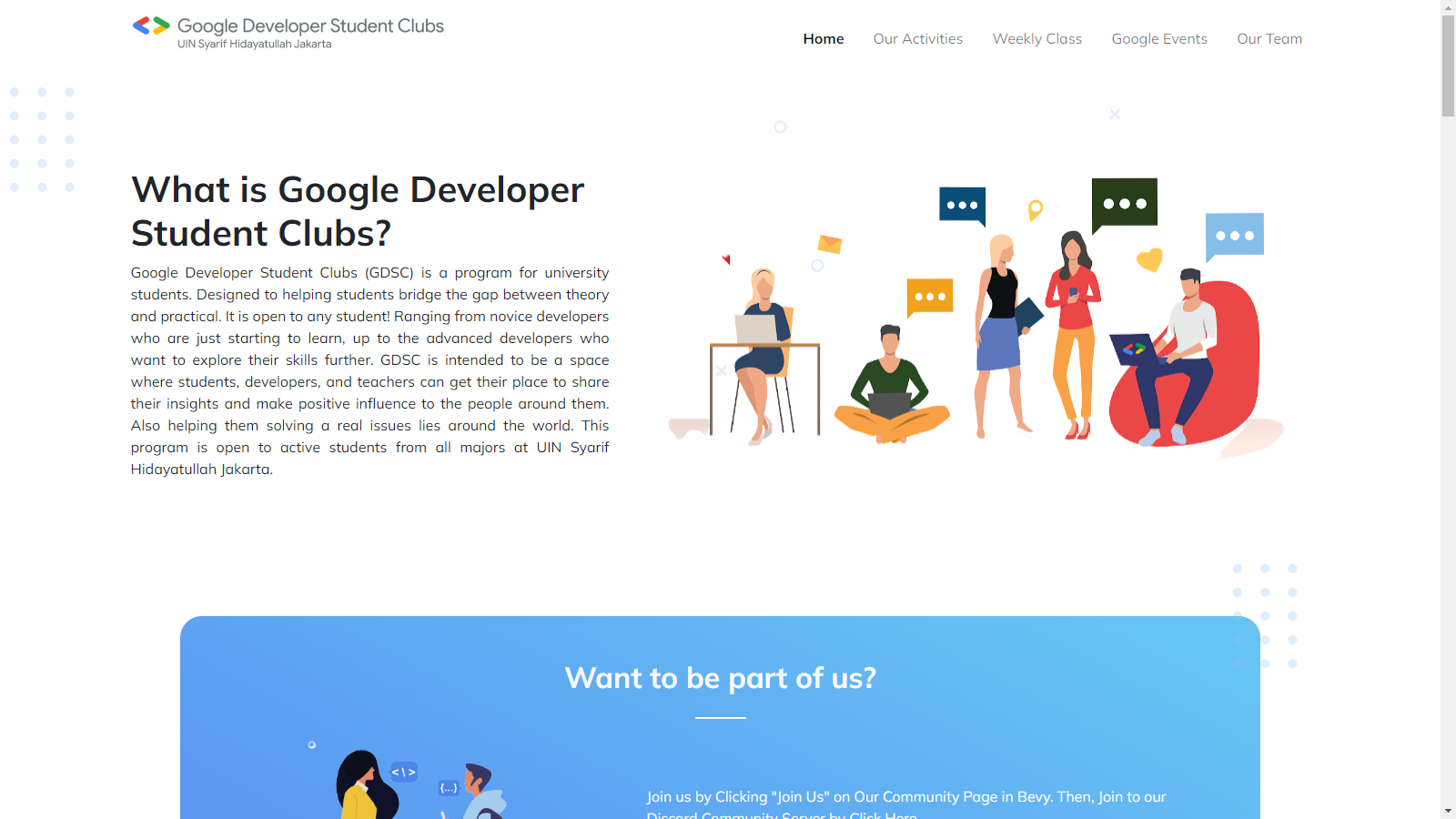 A website for Google Developer Student Clubs UIN Jakarta, an organization that aims to empower and support students to become future developers. The website is built using HTML, CSS, Bootstrap and JavaScript